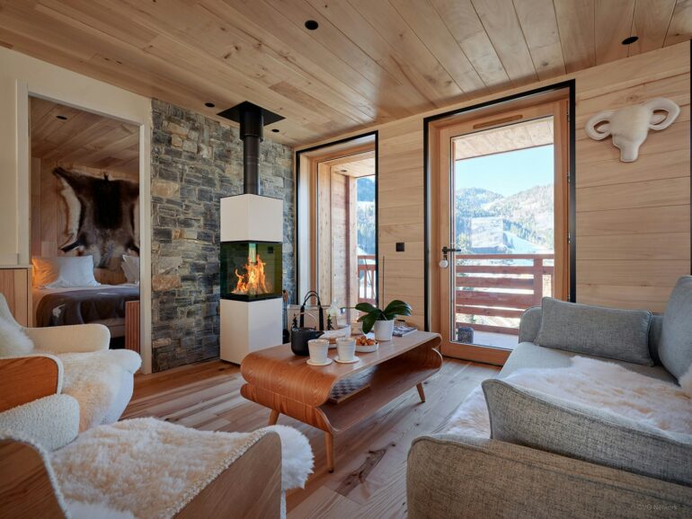 Das Chalet Kintana vereint modernes Design mit ursprünglicher Natürlichkeit. Die Weitzer Diele 2245 Plus in wilder Eiche mit gebürsteter Oberfläche und Fase unterstreicht den rustikalen Charakter des Hauses. Auf rund 136 m² wurde Gesund-Parkett von Weitzer Parkett verlegt – für ein Plus an Wohlfühlqualität.